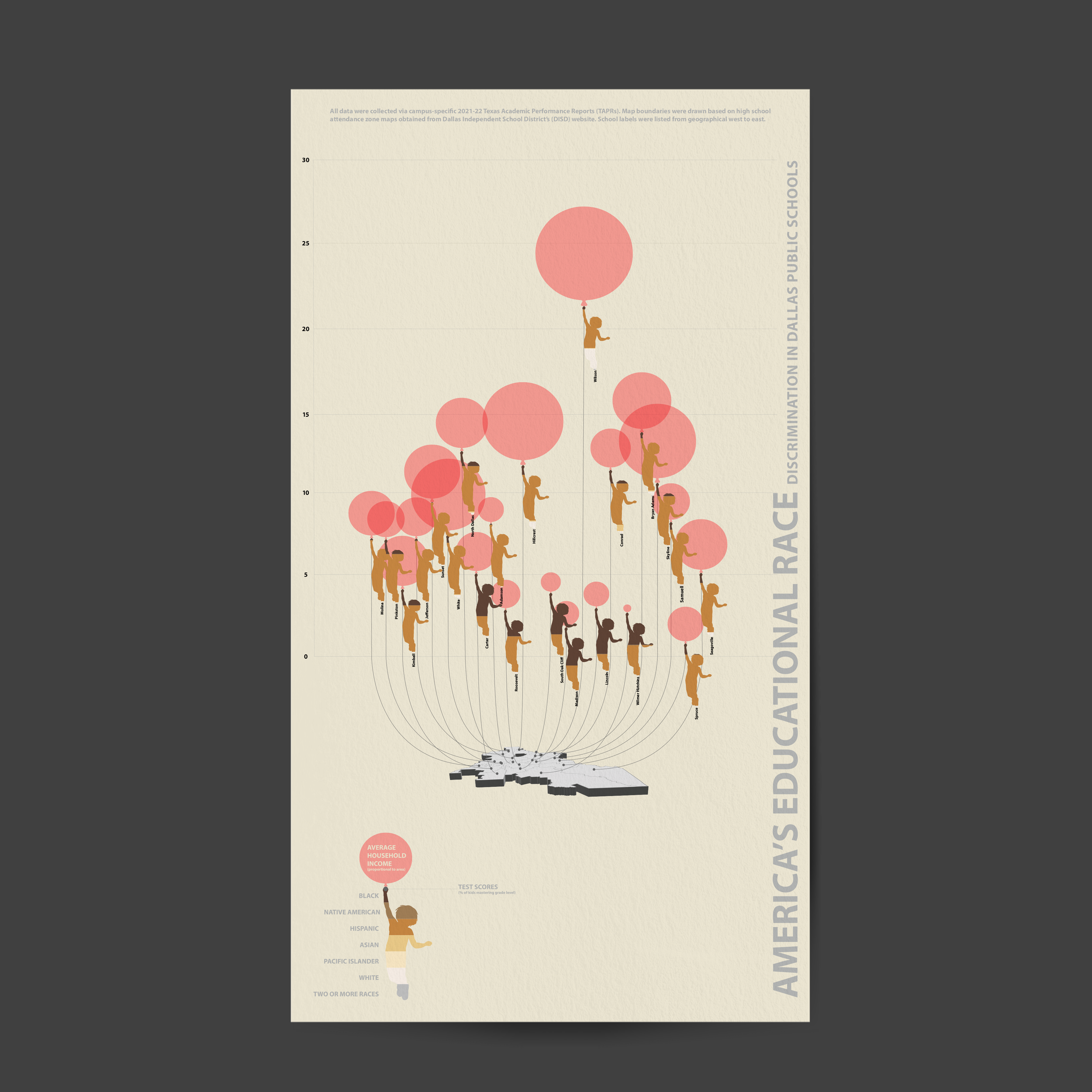 The focus of this 2023 project was the concept of educational gerrymandering, which is a contemporary form of segregation. Educational gerrymandering occurs when school attendance lines are drawn in order to discriminate against certain groups of individuals, often on the basis of race and/or income. This visualization, which utilizes the Dallas public school system as an example, demonstrates how extraneous factors (race, income level, etc.) often unjustly stifle educational attainment opportunities for learners.